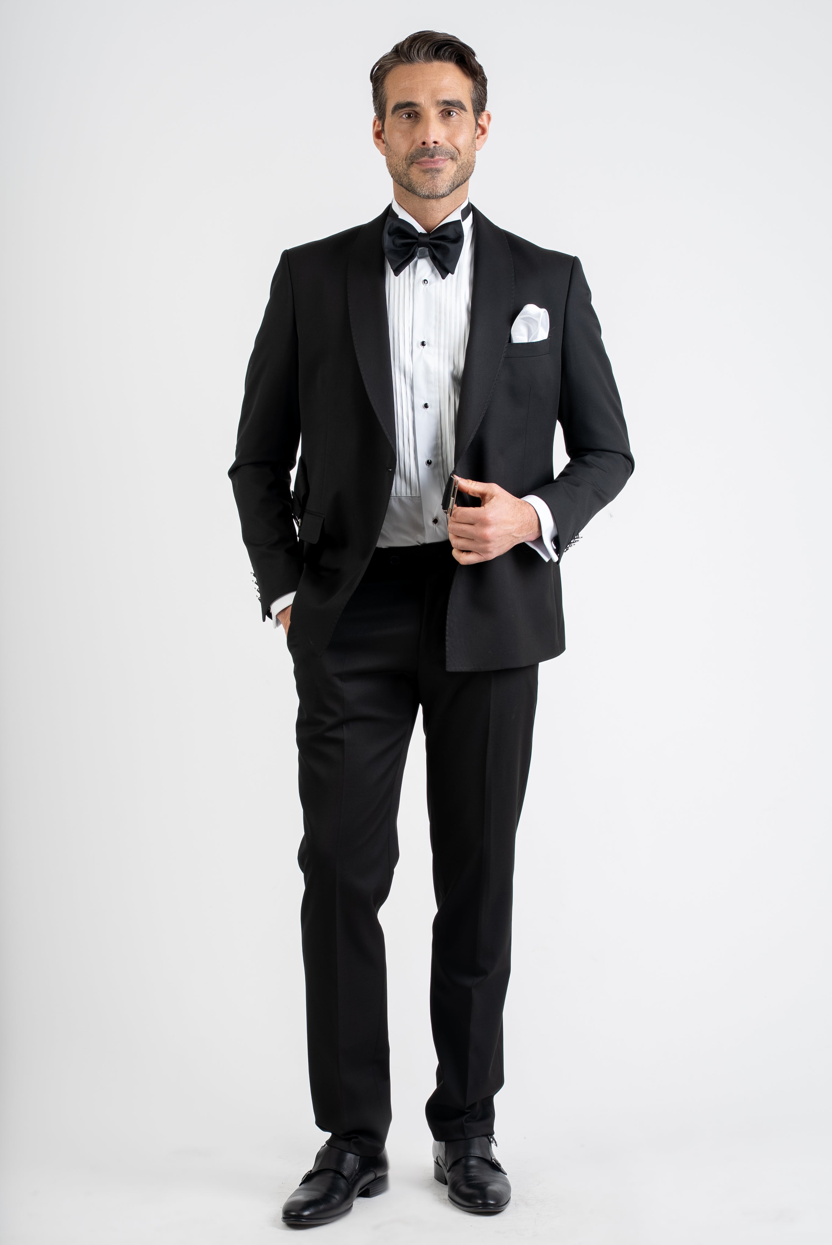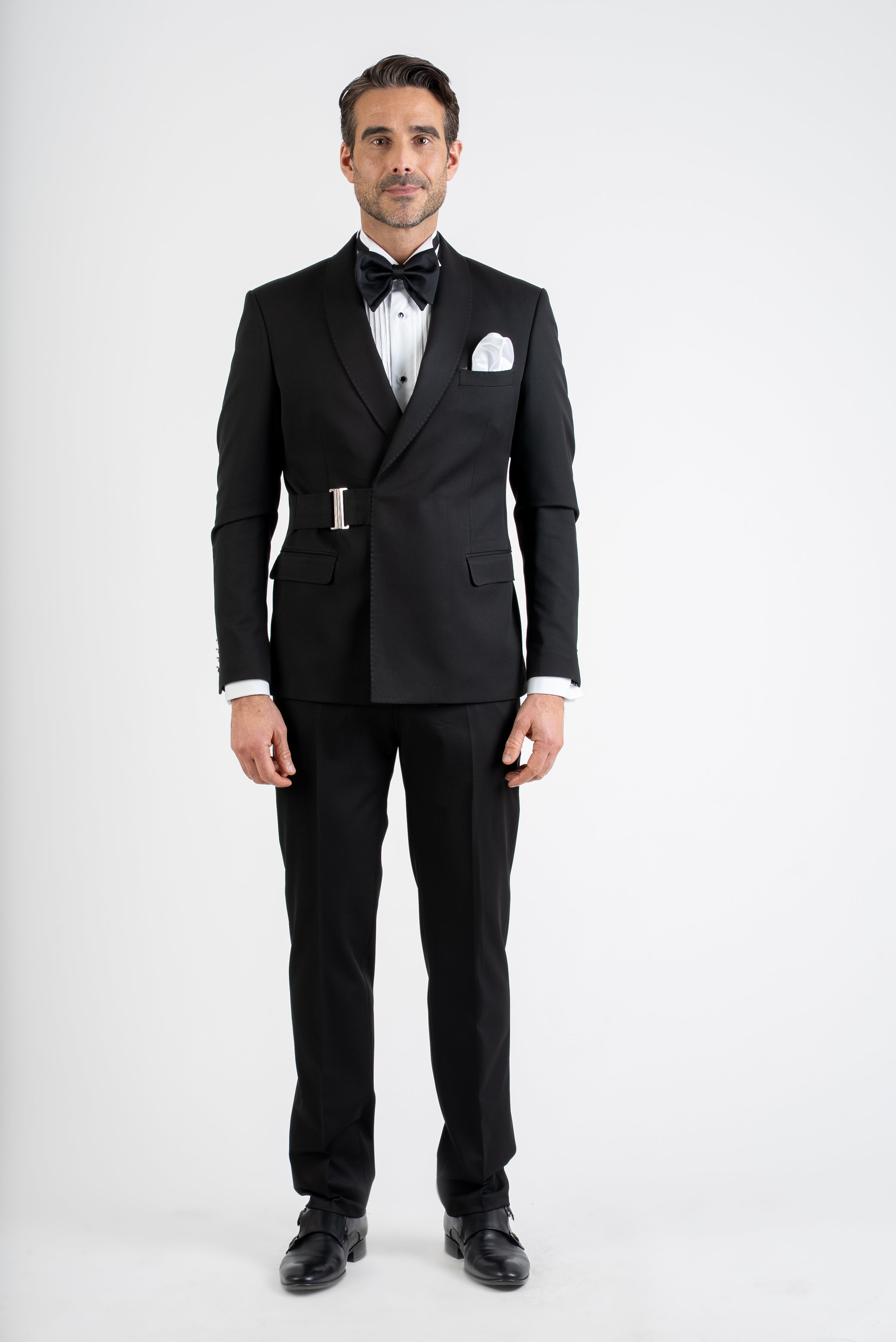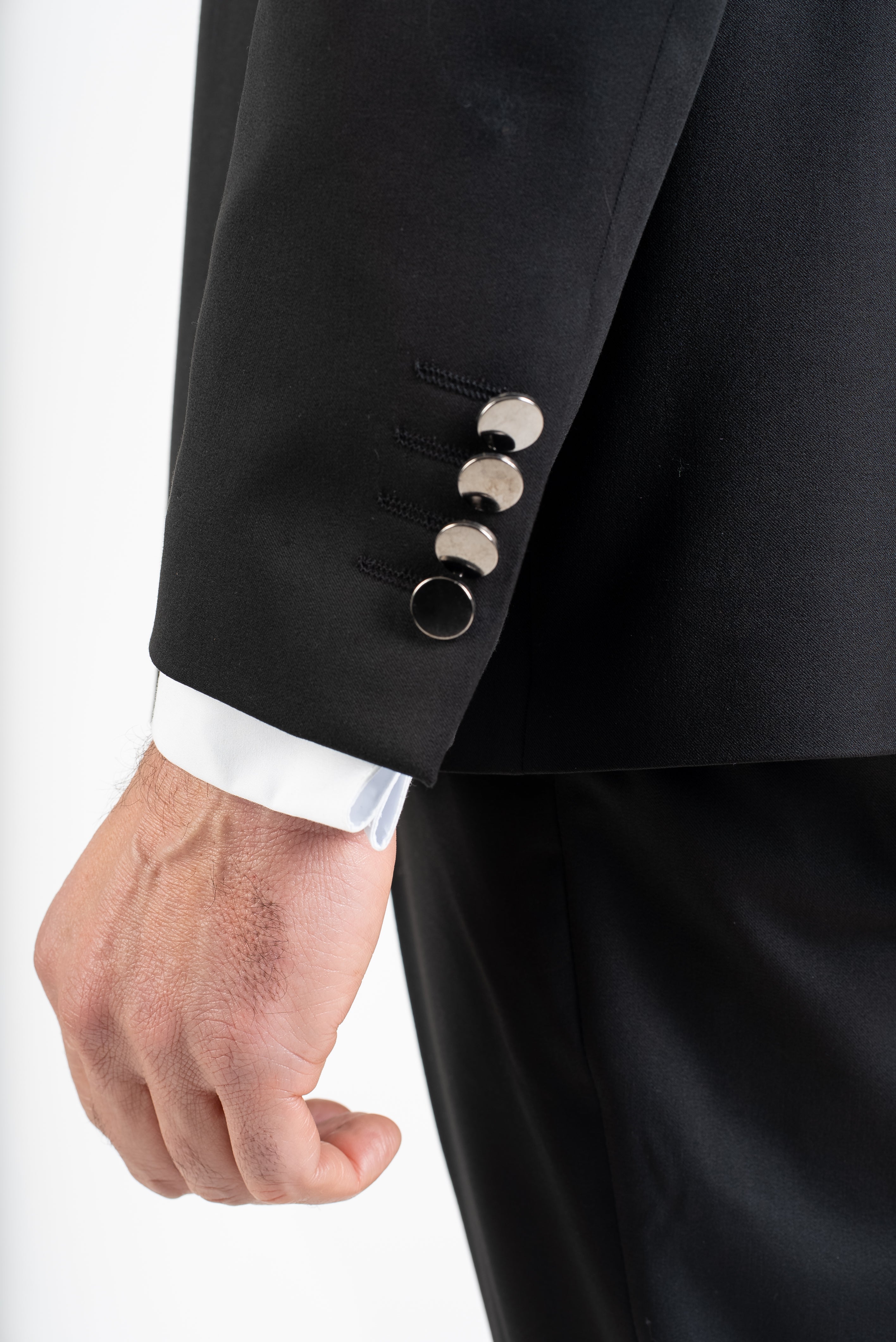The deep black tone reinforces a powerful and classic presence, making this suit a versatile choice for formal events, weddings, evening receptions, black-tie alternatives, and exclusive occasions. Its minimal yet striking design allows it to transition effortlessly from ceremonial wear to refined evening style.