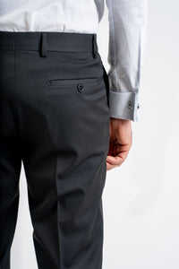 The set consists of a tailored jacket and matching trousers, crafted to create a clean, structured silhouette that enhances the masculine form. The jacket features a distinctive tailored design that adds a bold yet elegant character, while the trousers complete the look with sharp lines and a flawless fit.